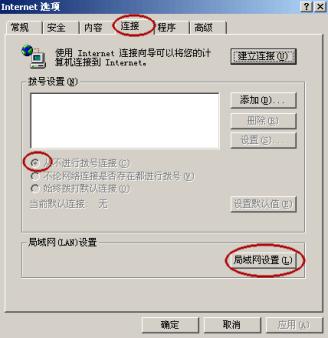 3)、安装途中步骤,点击“连接”==》 “从不进行拨号连接”==》最后进入“局域网设置”;