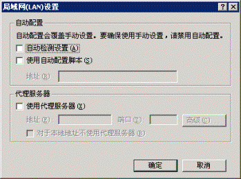 4)、进入局域网(LAN)设置后,检查前面三个方格是否全部空白,如图所示。(内部IP用户出外);然后点击"确定"。