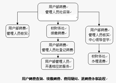 用户网费查询、续缴网费、费用疑问、退网费办事流程:
