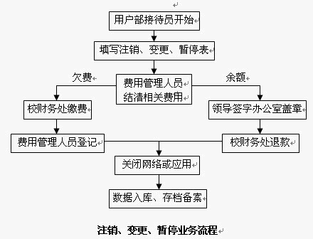 注销:不再使用信息管理中心提供的各类网络服务。 变更:暂停后重开,更改用户名、密码,更改注册地址,更改业务类型等。 暂停:由于某种原因暂停使用信息管理中心提供的各类网络服务。(结清费用,不退还余额) 注销、变更、暂停业务流程: 说明: 注销时须在中心费用管理人员处结清网络使用费,若有余额,管理人员开出余额单据交中心负责人签字办公室盖章后,到校财务处退还余额。